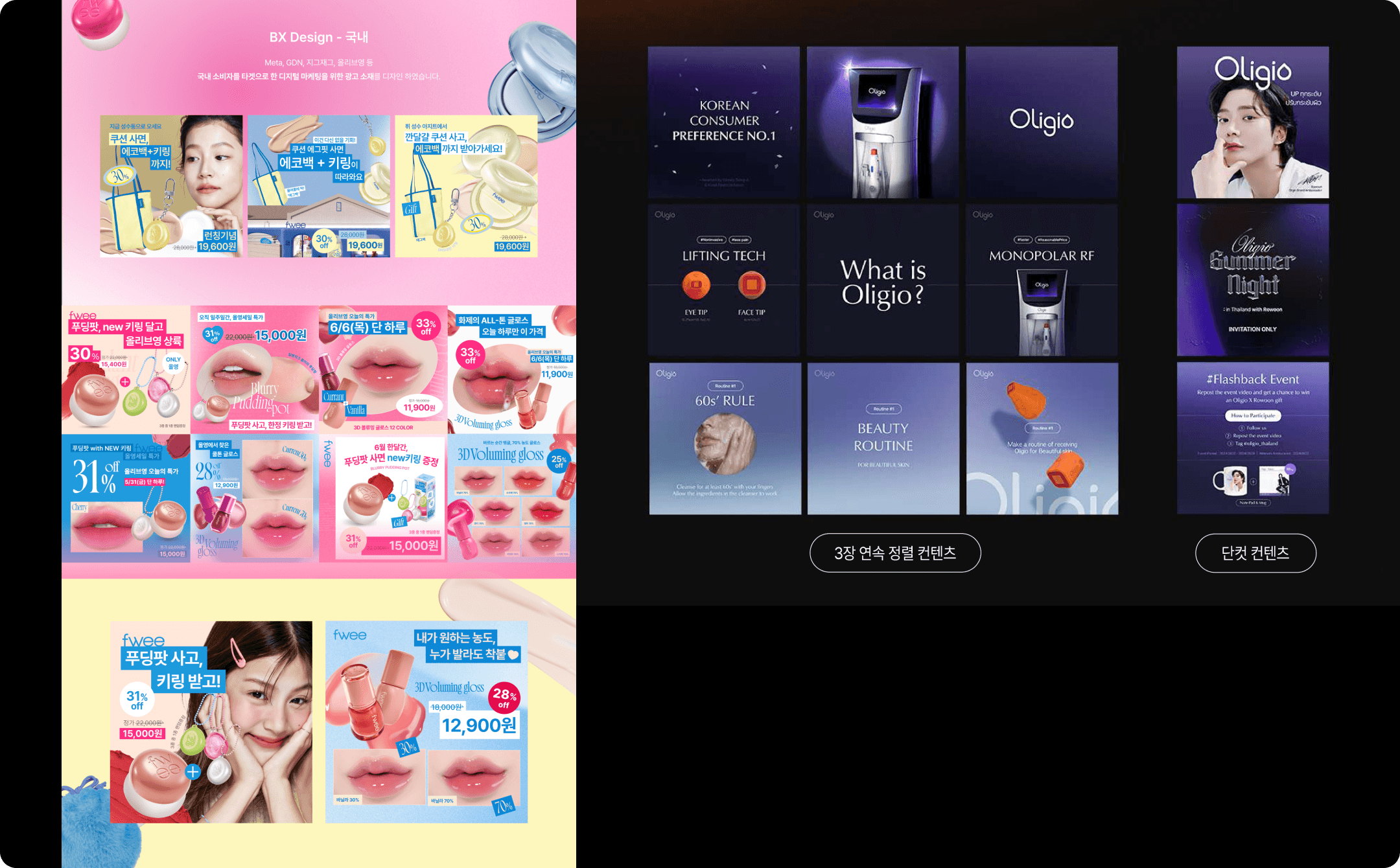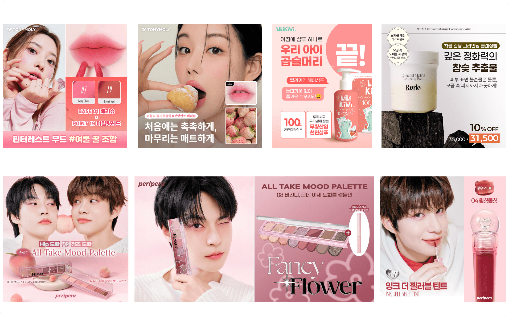 뷰티 카테고리는 특히 ①시각적 신뢰 ②성분·효능에 대한 이해 ③반복 노출을 통한 브랜드 인식, 이 3가지가 동시에 실행되어야 성과를 제대로 볼 수 있습니다. 그래서 뷰티 브랜드 마케팅에서는 광고 전략만큼이나 어떤 디자인을 꾸준히 만들어 가고 있는지가 중요해요.