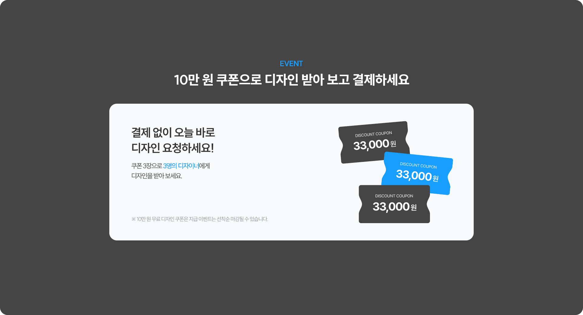뷰티 브랜드 마케팅 성과는 전략보다 먼저 빠르게 실행하여 고객에 각인시키는 것이 중요합니다. 따라서 시각적인 요소인 디자인이 마케팅에 있어서 핵심이죠. 지금 우리 브랜드에 어떤 디자인이 필요한지 떠올려 보세요. 그리고 그 첫 시작은 디자인 쿠폰으로 가볍게 받아 보는 것이 정답입니다.